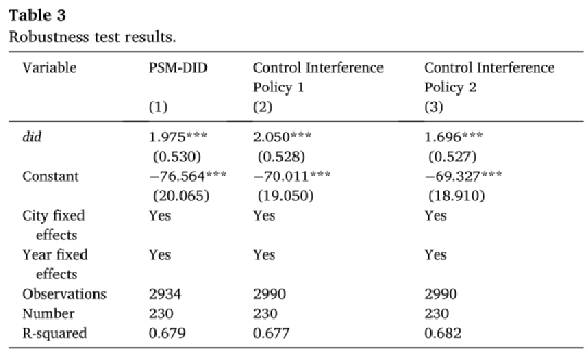 结果如下表Table3所示,表明智能城市试点政策在使用PSM-DID方法后仍能显著提高碳生产率。此外,本文还利用半径匹配和核密度匹配方法对初始样本进行了重新检验。它被发现与最近邻匹配结果一致。因此,它支持本文的实证结论,并证明了智能城市试点政策对提高碳生产率的巨大影响。