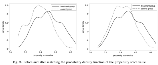 首先,本文借鉴了倾向分数匹配方法。根据配对结果,治疗组与对照组在配对后倾向得分值的概率密度基本相似,说明匹配效果较好,如Fig.3。最后,利用最近邻匹配估计方法对结果的可靠性进行了检验。