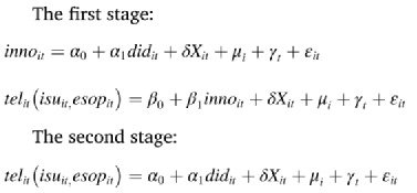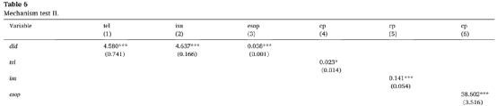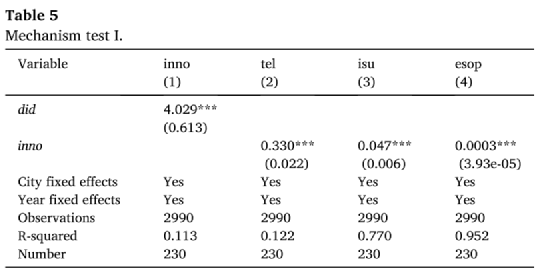 第一阶段的结果如下Table5所示,其中第(1)列用对创新绩效进行回归,表明智能城市试点政策促进了创新。列(2)-(4)给出了三个变量对创新绩效的回归结果,表明创新支持技术进步、产业结构升级和能源结构优化。