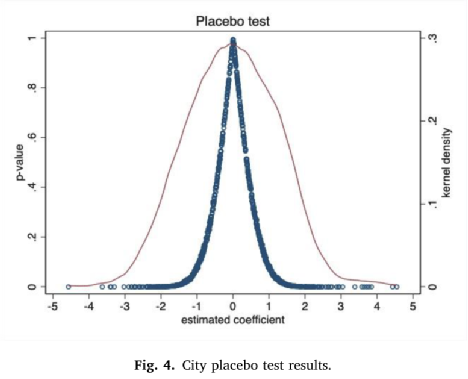 经过1000次重复处理,得到1000次回归系数和p值.给出了这1000系数估计的核密度分布和p-值。估计系数主要集中在零点附近,服从正态分布。可以排除其他政策或随机性因素可能影响本研究的基准估计结果。