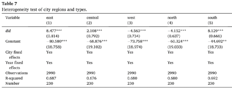(一)城市地域异质性根据东部、中部和西部三个区域对样本城市进行异质性检验,而东北中国、辽宁、吉林和黑龙江三省则按统计目的将其划分为东部。结果如下Table7所示,研究表明,智能城市试点政策提高了东部和中部城市的碳生产率。改善效果在东部城市更为明显。相反,它对西部城市的碳生产力有显著的抑制作用。