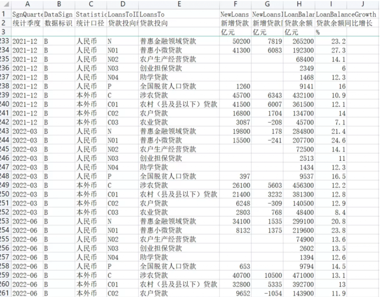[color=rgba(0, 0, 0, 0.9)]统计季度、数据标识、统计口径、贷款投向编码、贷款投向、新增贷款、新增贷款同比增减、贷款余额、贷款余额同比增长、农村(县及县以下)贷款、农户贷款、农业贷款、农村贷款