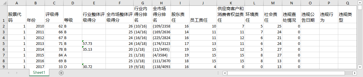 近年来,我国资本市场公司违规案件频繁发生,严重扰乱市场秩序、打击投资者信心,造成恶劣的社会影响。 2018 年 7 月爆发的长生生物“问题疫苗”恶意造假事件,引发全社会的愤怒和不满,这种以危及公众生命健康来谋取非法利润的违法行径,无疑是企业社会责任严重缺失的表现。所以,厘清企业社会责任和公司违规行为之间的关系,具有现实指导意义。企业社会责任(CSR)对公司治理问题存在两种不同的经济效应:“抑制效应”和“饰窗效应”。那么针对公司违规行为,企业社会责任会产生何种影响呢?1、数据来源:ppmandata数据库2、时间跨度:2010-2020年3、区域范围:沪深A股上市公司4、指标说明:[color=rgba(0, 0, 0, 0.9)]股票代码 年份 评级得分 等级 行业整体评级得分 全市场整体评级得分 行业内得分排名 全市场得分排名 股东责任 员工责任 供应商客户和消费者权益责任 环境责任 社会责任 违规查处情况 违规公告日期 违规行为 违规类型