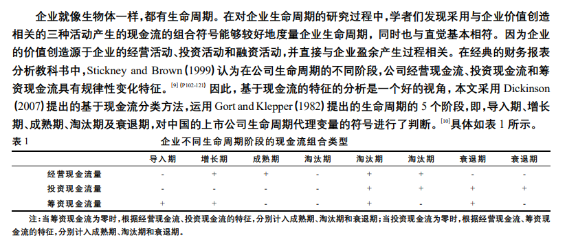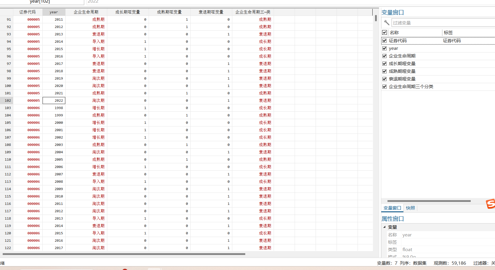 企业生命周期数据1999-2022年,数据处理参考尹 闪(2009)的文章,根据现金流量方式特征,采用 Dickinson(2007)提出的基于现金流分类方法,运用 Gort and Kleppe(r 1982)提出的生命周期的 5 个阶段,导入期、增长期、成熟期、淘汰期及衰退期,对中国的上市公司生命周期代理变量的符号进行了判断数据处理结果见截图