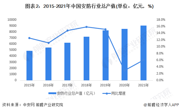 在经济快速发展、国内安防需求不断增长的背景下,我国安防市场整体发展迅速。据中安网数据,2020年我国安防行业总产值达到8510亿元,同比增长2.9%。2021年我国安防行业行业产值达到9020亿元。
