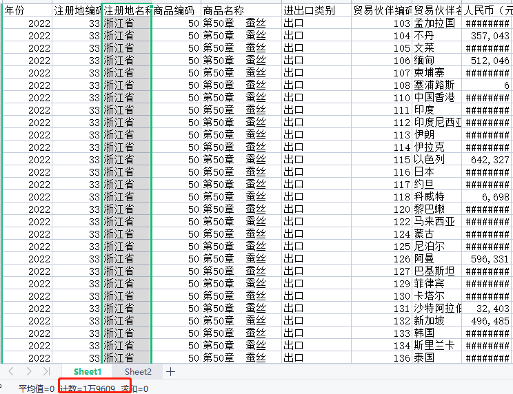 数据量19600+行,浙江省纺织品HS50-63章,对各国的出口明细数据