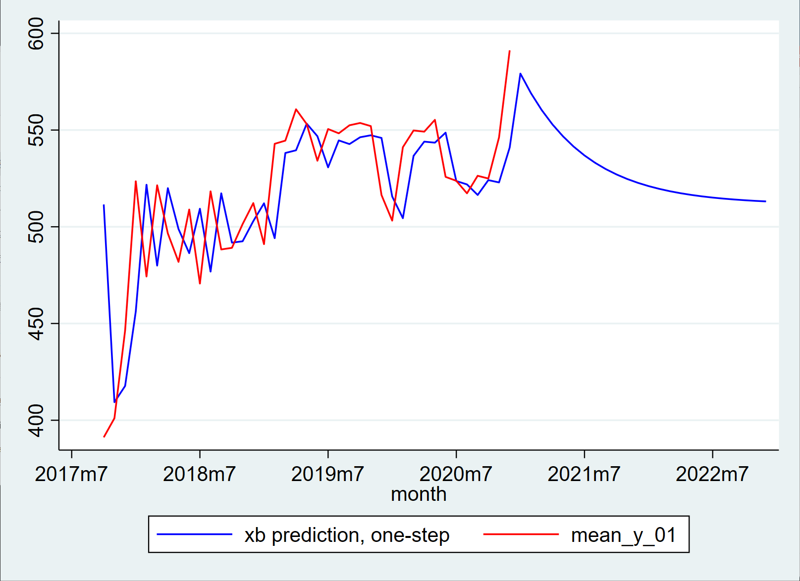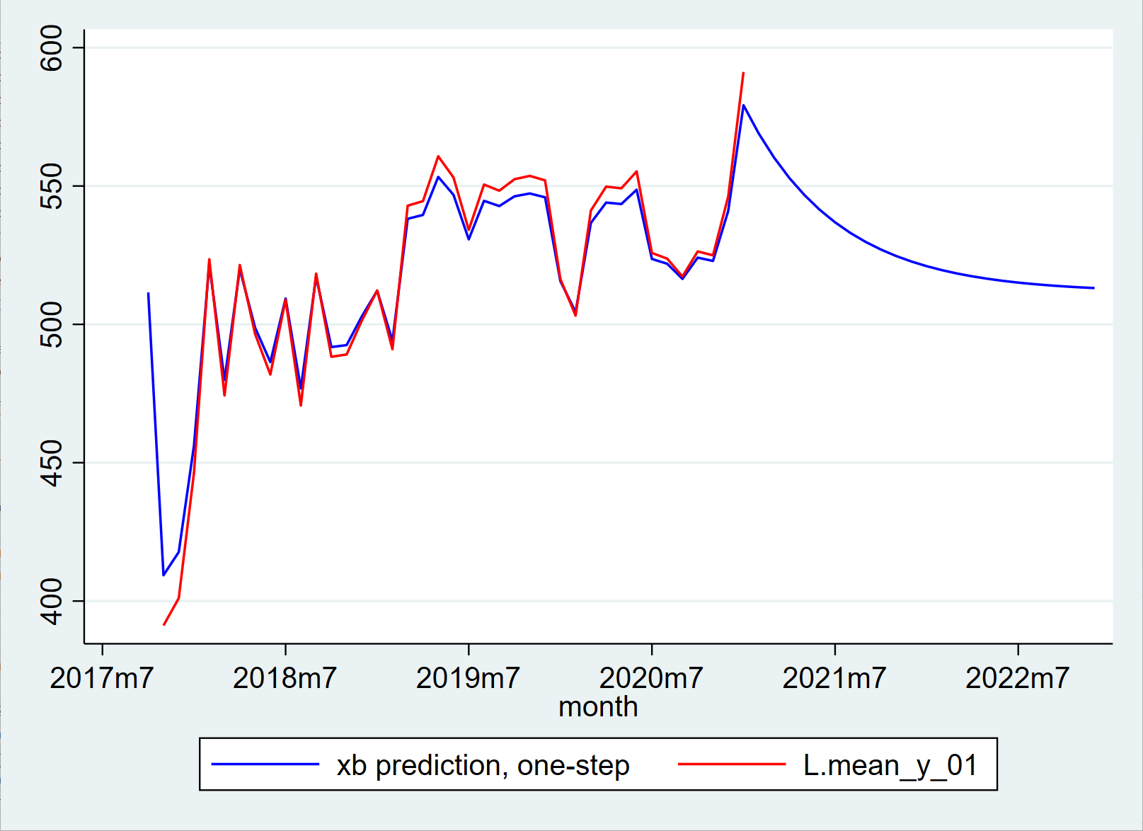 想用原数据预测未来两年的数据,AR(1)预测和Y原数据滞后一阶作图图一,AR(1)预测Y1和Y原数据作图图二,应该以哪个图为准呢
