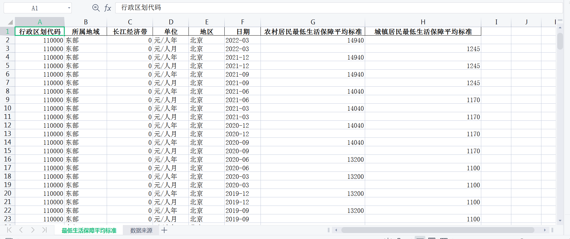 全国31省最低生活保障平均标准数据【2008-2022年】