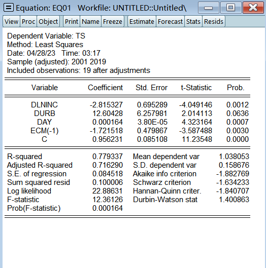 模型主要是研究城镇居民收入与产业结构的关系?TS是产业结构高级化,DLNINC是城镇居民人均可支配收入,DURB是城镇化,DAY是城镇居民人均消费支出,想问一下模型正确吗?DLNINC的系数为负正确吗?符合现实意义嘛?