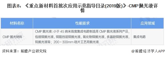 为进一步做好重点新材料首批次应用保险补偿试点工作,工信部于2019年12月发布的《重点新材料首批次应用示范指导目录(2019版)》(自2020年1月1日起施行),其中关于CMP抛光液的入选情况如下: