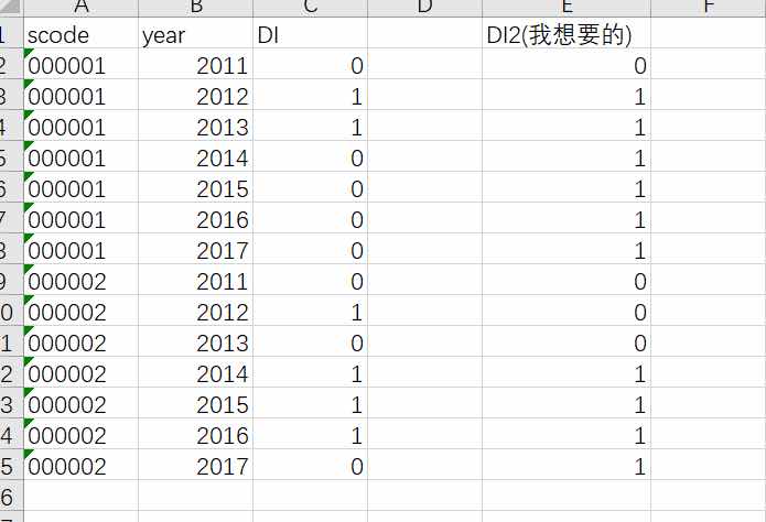 songking 发表于 2023-5-12 22:17 tsset scode year gen DI2=DI if DI==1 by id :replace DI2=1 if l.DI2==l2.DI2&l.DI2!=.