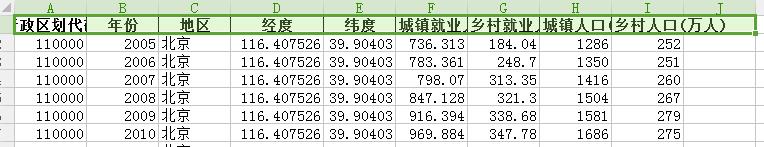 指标包括:行政区划代码、年份 、地区、 经度 、纬度、 城镇就业人员数(万人) 、乡村就业人员数(万人)、 城镇人口(万人) 、乡村人口(万人)。