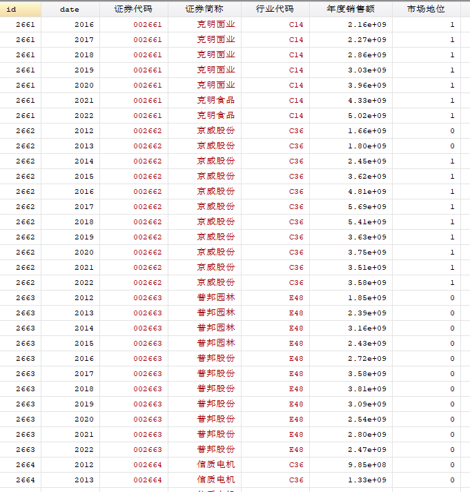 2.计算说明:将市场地位定义为企业i的年度销售额占行业内所有企业的年度销售额之和的比例,用虚拟变量引入模型。市场地位分类的标准为:当企业年度销售额与行业销售额的比率大于行业样本中位数时,则将这个企业市场地位虚拟变量MP定义为1,否则定义为0,即MP=1表示企业的市场地位高,MP=0表示企业的市场地位低。