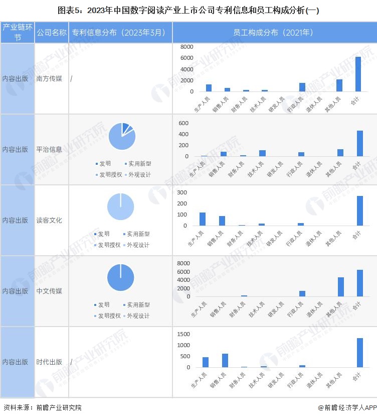 从数字阅读行业的上市企业已有的公开信息分析,专利信息相对较多的企业是腾讯控股(00700.HK),专利总数1194条;员工总数最多的是中文传媒(600373.SH),员工总数为6541人。