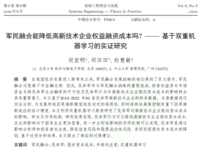 自我国经济发展进入新常来以来,军民融合发展战略的地位得到了巨大提升,军民融合过程离不开金融支持。 因此, 民参军作为军民融合战略的重要组成,探索权益资本市场资金支持民参军企业融资的可行性及民参军行为对高新技术企业股权资本成本的影响特点具有重要意义。
