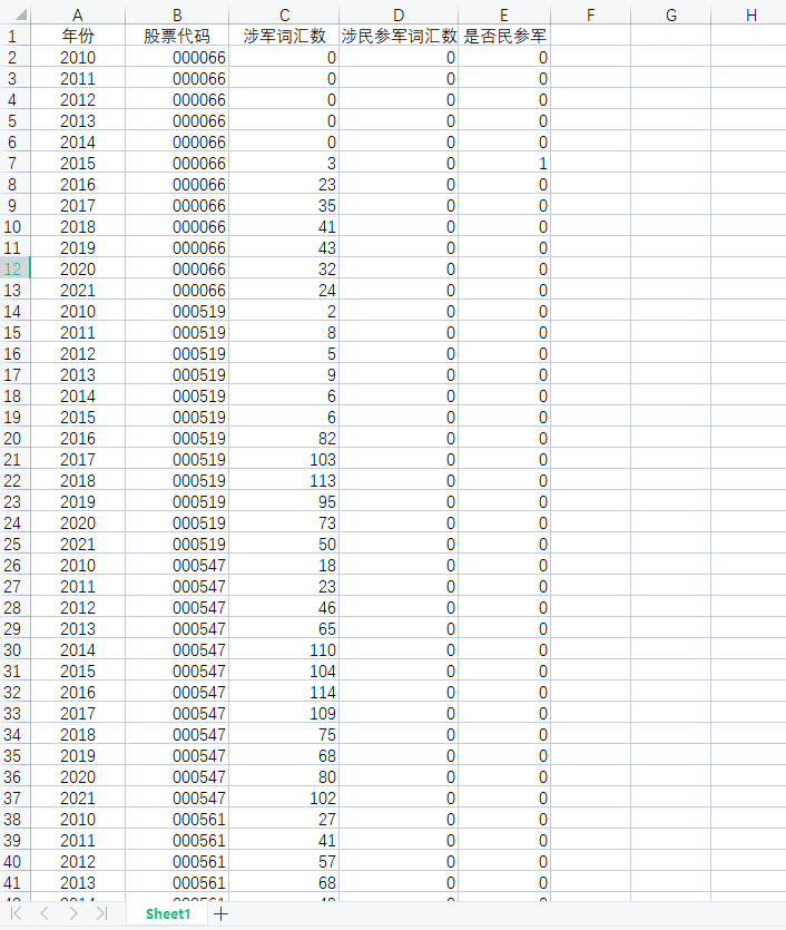 · 由于目前尚没有官方的涉军词库,根据倪宣明(2023)的研究,浏览了军工板块企业年报,得出了一些普遍使用的涉军词汇,并基于此构建涉军词库:军用、军工、军品、军事、军队、武装、军规、武器、国防、防务、强军、空军、海军、陆军、军种、兵种,共计16个词汇