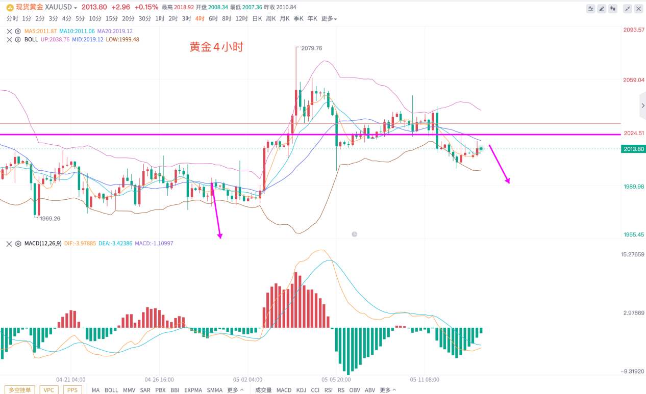 如图,金价在上周五出现一波下跌,美盘时间反弹确认了2020的压力点,受制于4小时boll中轨的位置测试,下方靠近2000美元前期低点的位置反弹,今天还是关注2020美元压力点的位置,守住了这里将继续向下挑战2000美元的位置,区间卡在2000-2020美元的位置,尤其明天关于美国债务上限是否取消的会议,定会给黄金价格波动带来突破。