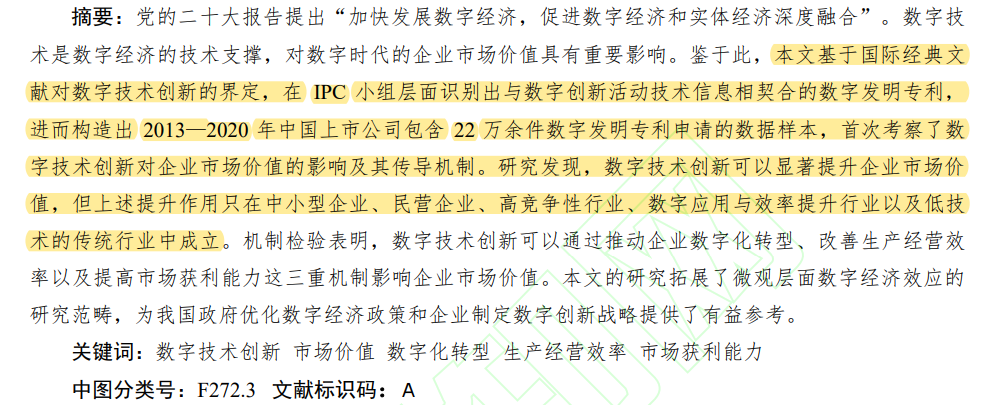 本文基于国际经典文献对数字技术创新的界定,在IPC小组层面识别出与数字创新活动技术信息相契合的数字发明专利,进而构造出2013-2020年中国上市公司包含22万余件数字发明专利申请的数据样本,首次考察了数字技术创新对企业市场价值的影响及其传导机制。研究发现,数字技术创新可以显著提升企业市场价值,但上述提升作用只在中小型企业、民营企业、高竞争性行业、数字应用与效率提升行业以及低技术的传统行业中成立。