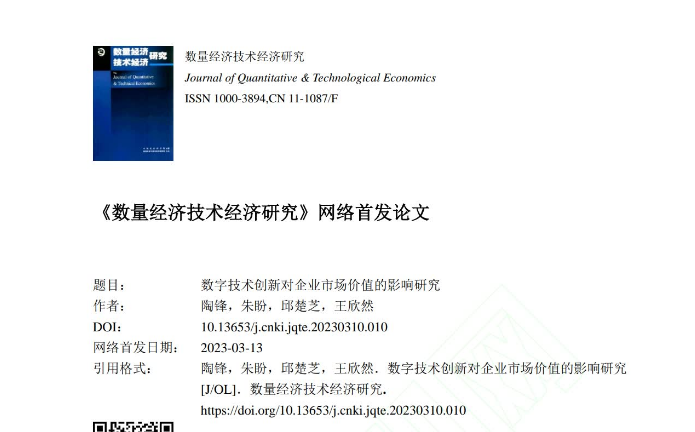 陶锋,朱盼,邱楚芝,王欣然.数字技术创新对企业市场价值的影响研究[J/OL].数量经济技术经济研究:1-24[2023-05-08].