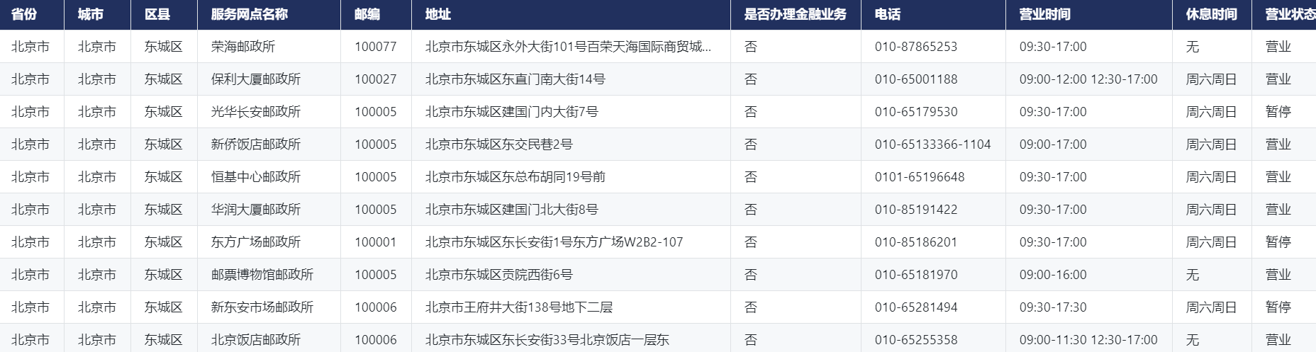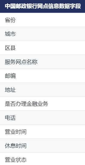 中国邮政储蓄银行网点信息数据,包含全国31个省、直辖市及对应300多个地级市逾5万个网点分布信息、营业状态信息及营休情况,为区域经济、农村金融、银行经营方面的研究提供数据支持。