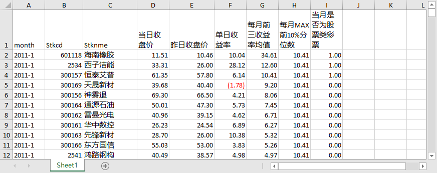 month Stkcd Stknme 当日收盘价 昨日收盘价 单日收益率 每月前三收益率均值 每月MAX前10%分位数 当月是否为股票类彩票