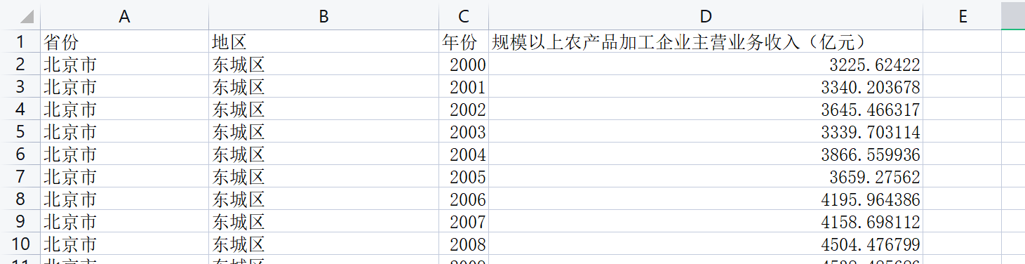 指标包括:省份 地区 年份 规模以上农产品加工企业主营业务收入(亿元)
