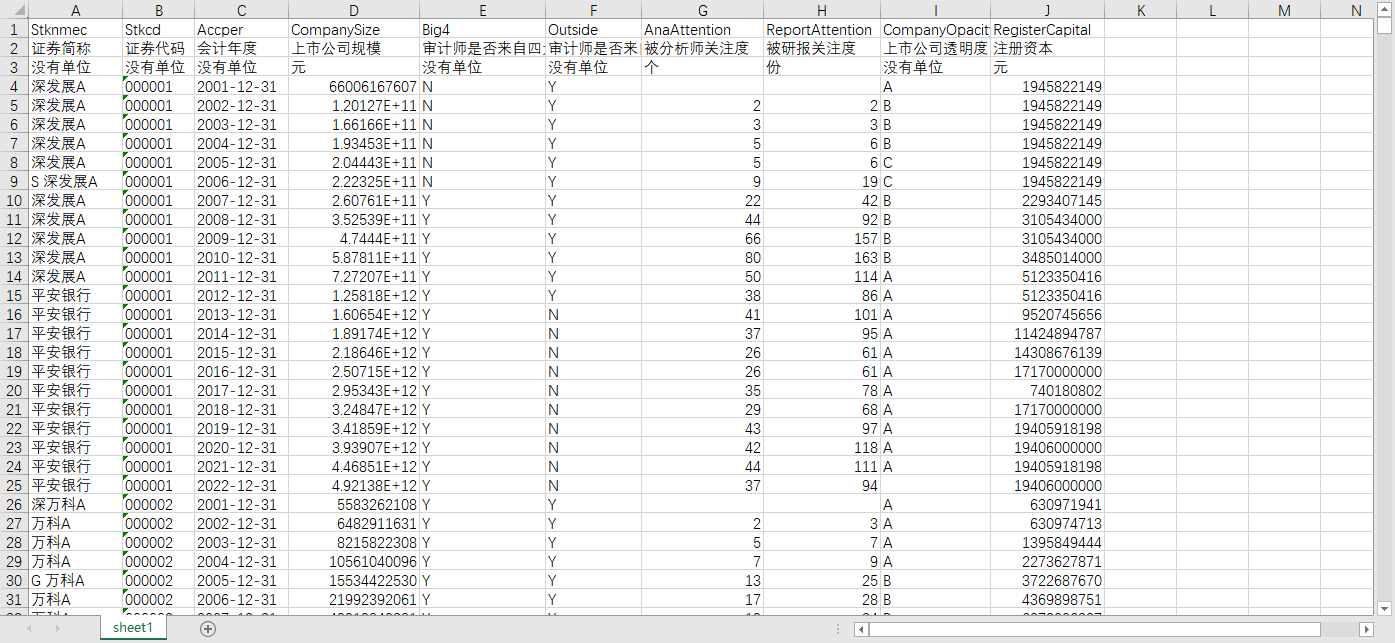 证券简称 证券代码 会计年度 上市公司规模 审计师是否来自四大会计师事务所 审计师是否来自境外会计师事务所 被分析师关注度 被研报关注度 上市公司透明度 注册资本
