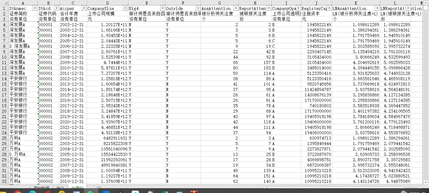 证券简称 证券代码 会计年度 上市公司规模 审计师是否来自四大会计师事务所 审计师是否来自境外会计师事务所 被分析师关注度 被研报关注度 上市公司透明度 注册资本 LN(被分析师关注度+1) LN(被研报关注度+1)