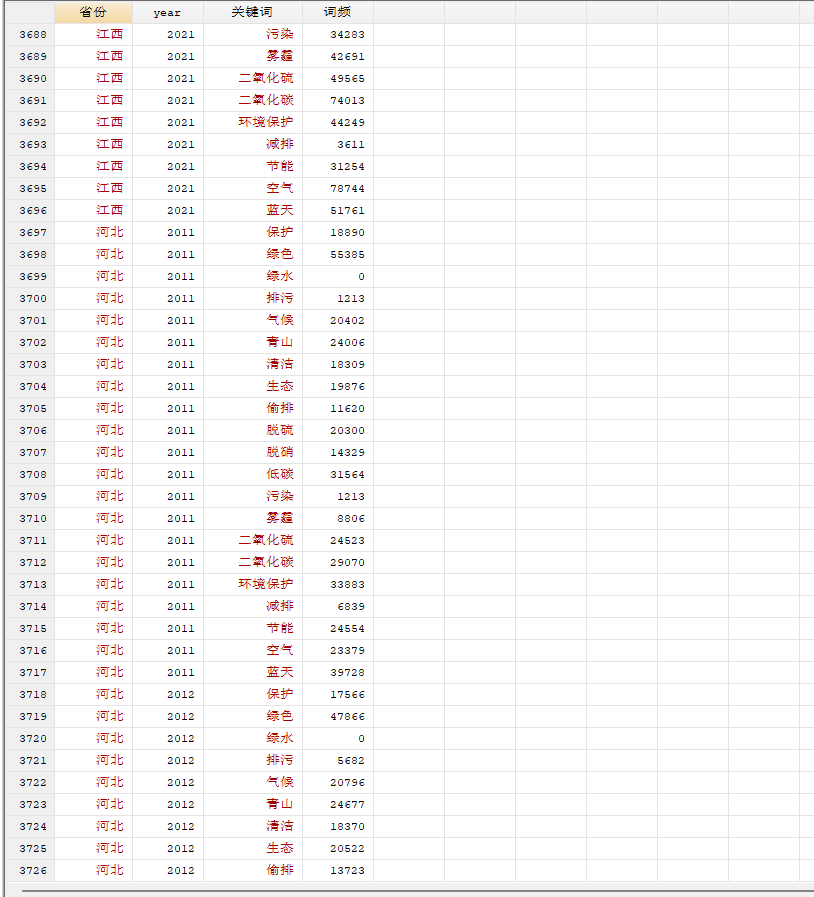 关键词包括:低碳、二氧化硫、二氧化碳、环境保护、减排、节能、空气、蓝天、绿色、绿水 、排污 气候、青山、清洁、生态、偷排、脱硫、脱硝、污染、雾霾