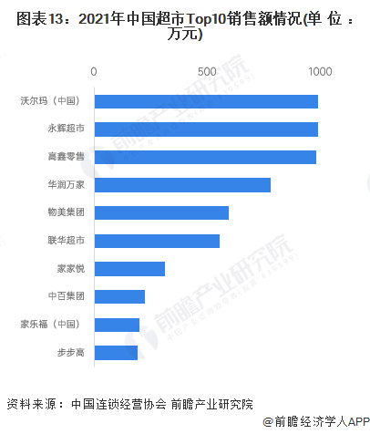 根据中国连锁经营协会发布排名,2021年沃尔玛以990.36亿元的销售规模排名第一,其次是永辉超市,销售规模达989.69亿元;排名第三的高鑫零售2021年销售总计980.05亿元。