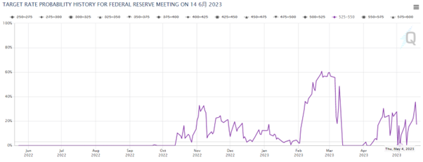 近两周,由于银行危机与美债上限的警报有所缓解,令市场中的加息预期逐渐升温。然而在上周五鲍威尔讲话之后,加息预期再次降温。