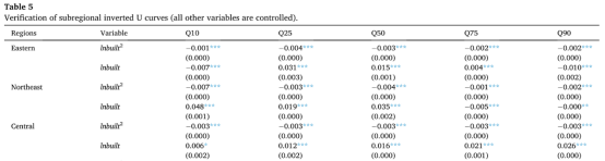 对于非线性回归,从表4和表5二次系数大部分为负值,而主系数在1%的显着性水平上为正。这些结果突出了城市扩张与城乡收入差距之间的倒U关系。换句话说,城市扩张首先增加了城乡收入差距,然后显示出缩小效应。