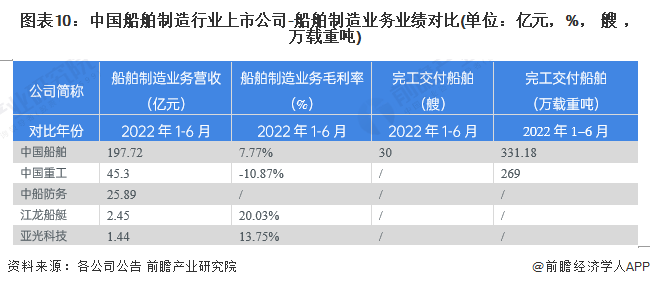 从船舶制造业务业绩来看,我国船舶制造行业的龙头上市公司是中国船舶和中国重工,2022年1-6月,造船完工量分别为331.18万载重吨和269万载重吨。江龙船艇和亚光科技的船舶制造业务规模则相对偏小。