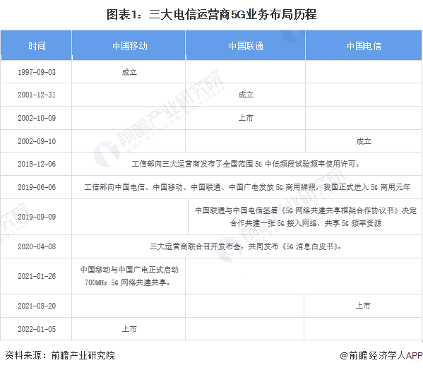 目前,中国5G行业龙头企业分别是中国移动(600941.SH 0941.HK)、中国联通(600050.SH 0762.HK)、中国电信(601728.SH 0728.HK),三家企业在5G业务上的布局历程如下: