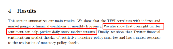 就在昨晚,美联储经济学家发布了一篇论文《More than Words: Twitter Chatter and Financial MarketSentiment》,文中提出了一个衡量市场预期的新指标——Twitter金融情绪指标TFSI。美联储通过Twitter 2007年以来超过440万条推文以及期间股市的日浮动数据对AI模型进行训练,从而得到情绪指数。让我们直接跳到结论,隔夜情绪指标能够有效辅助预测股票市场的下一个交易日的表现。举例来说,如果隔夜情绪指标较好,便代表交易员的推文中普遍看好股市,隔天交易日的股市表现便有更大的概率看涨。这个指标的优势在于先行,交易员在实际下单前,可能会通过社交媒体直抒胸臆,因此给出的信号更加提前。