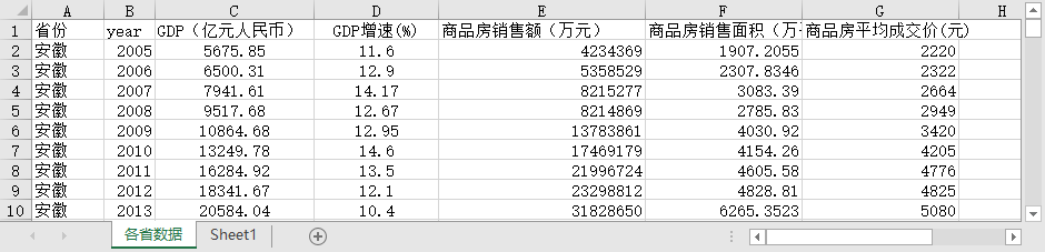 省份 year GDP(亿元人民币) GDP增速(%) 商品房销售额(万元) 商品房销售面积(万平方米) 商品房平均成交价(元)