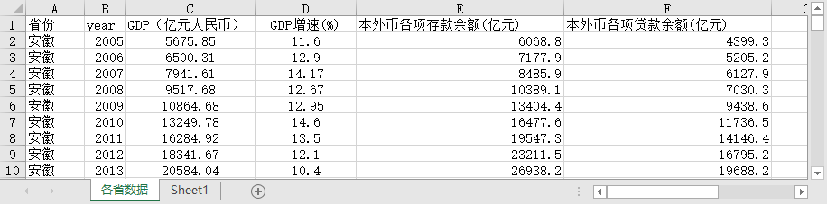 省份 year GDP(亿元人民币) GDP增速(%) 本外币各项存款余额(亿元) 本外币各项贷款余额(亿元) 本外币各项存贷款余额(亿元) 金融发展水平指数%=本外币各项存贷款余额/GDP*100