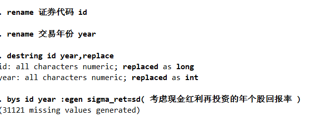 从国泰安下载了年个股回报率,然后想用stata求标准差,用了以下代码却显示都是生成缺失值,怎么办呢