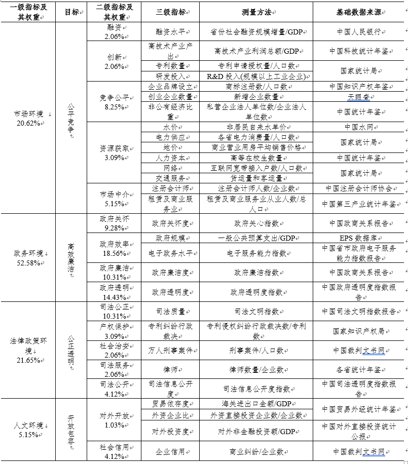 根据您的描述,从2017年到2020年对我国各省份的营商环境进行了评估,其核心框架由四个一级指标组成:市场环境、政务环境、法律政策环境与人文环境。每个一级指标下又细分出二级指标共计16个,并通过进一步细化形成了包含29项三级指标的完整评价体系。