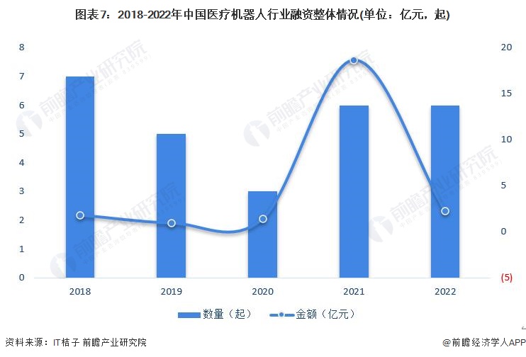 2018-2022年,我国医疗机器人行业的投融资事件呈波动趋势,2018年相关投融事件数量最多,为7起,投融资金额规模1.80亿元。随后投融资市场活跃程度有一定程度下降,且较为波动。2021-2022年,我国医疗机器人行业投融资市场逐渐回温,2022年我国医疗机器人行业的投融资事件数量为6起,金额规模为2.23亿元。