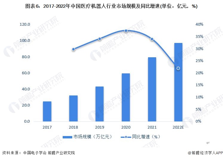 2017-2021年,我国医疗机器人的市场规模增速均在20%以上,行业历经快速发展。2021年,我国医疗机器人市场规模达到79.3亿元,同比增长34.01%。初步测算,2022年我国医疗机器人市场规模为97.1亿元。