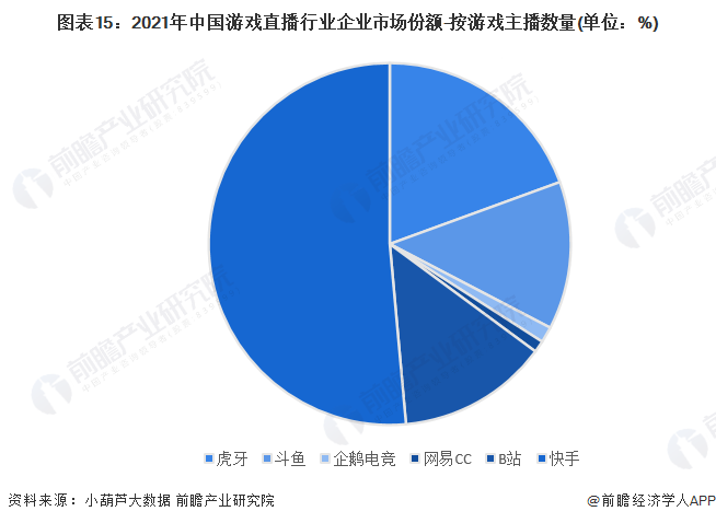 2021年,从游戏直播企业角度分析,快手游戏主播数量为621.2万人,占比最多,为51.88%;其次为虎牙,游戏主播人数为234.8万人,占比19.61%,第三为斗鱼直播,游戏主播人数为159.6万人,占比13.33%。