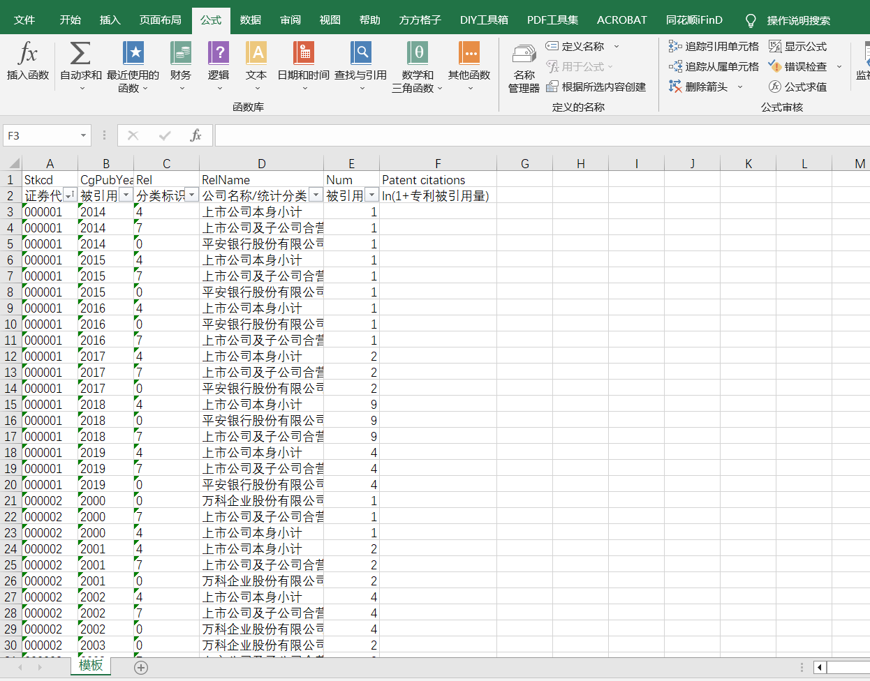 如图,大佬们看过来。我希望最后一列ln(1+专利被引量)中的专利被引量,是该年之后两年内的被引量加总,比如2014年的被引用量为2015和2016的专利被引用量加总,纯小白,希望有大佬能救救我
