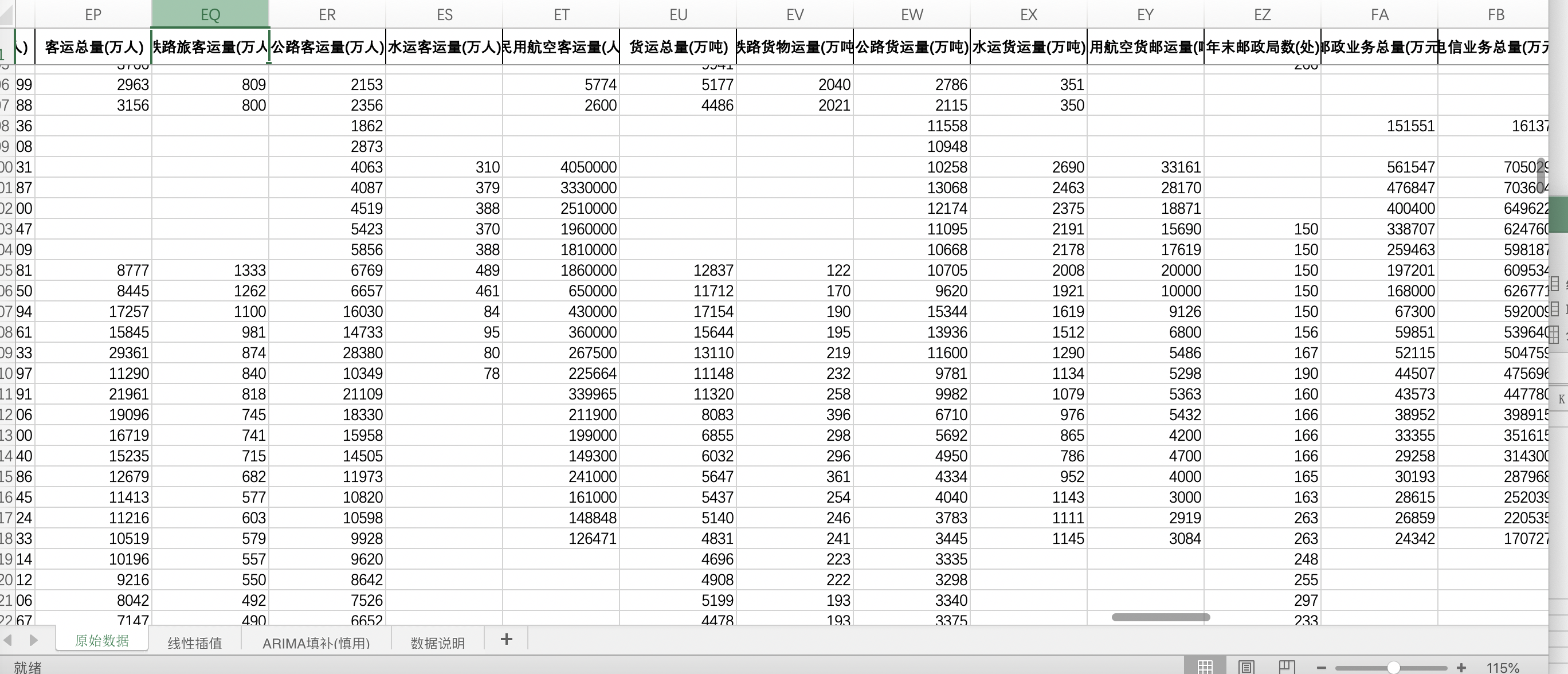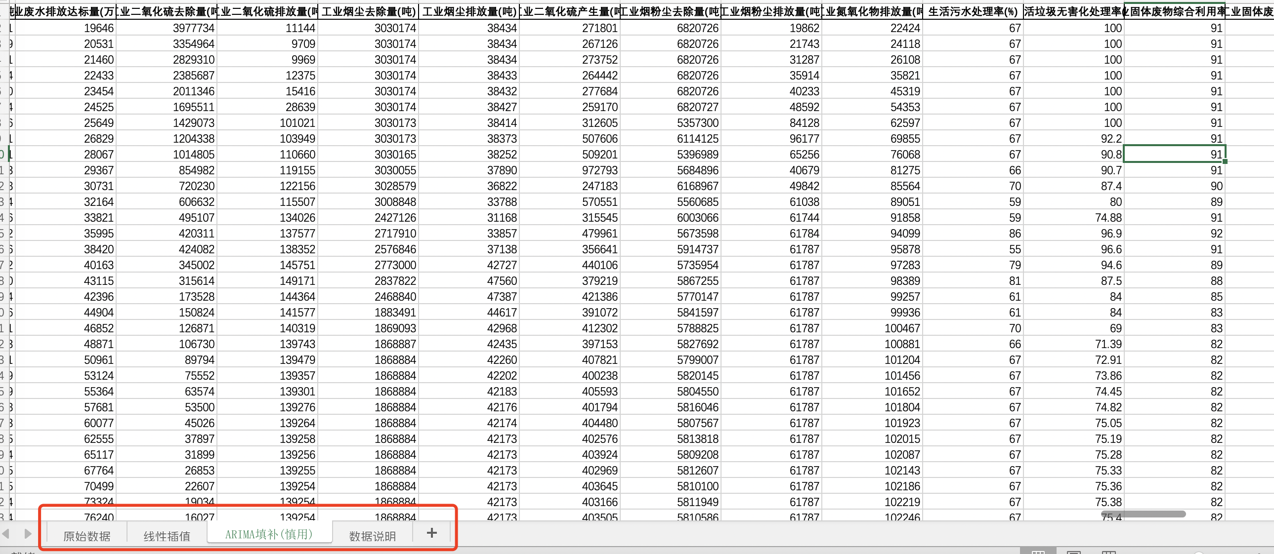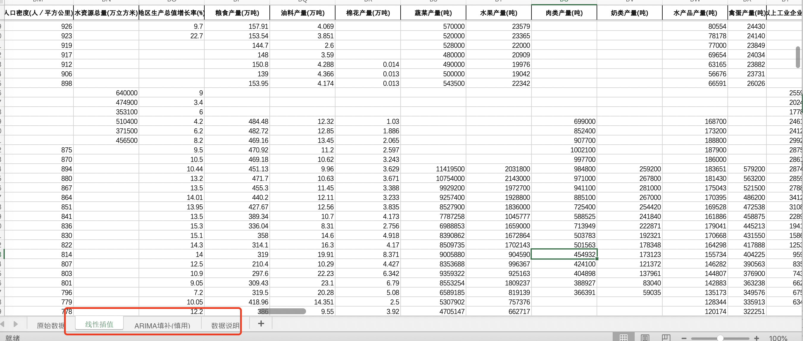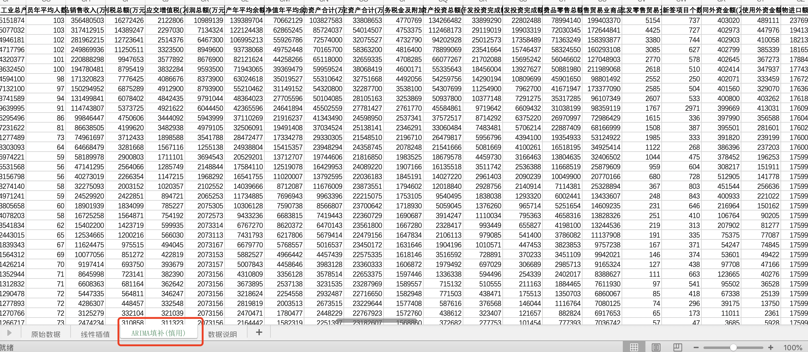 线性插值。利用数据的线性趋势,对各年份中间的缺失部分进行填充,得到线性插值版数据,这也是学者最常用的插值方式。 ARIMA填补。基于ARIMA模型,利用同一地区的时间序列数据,对缺失值进行预测填补。