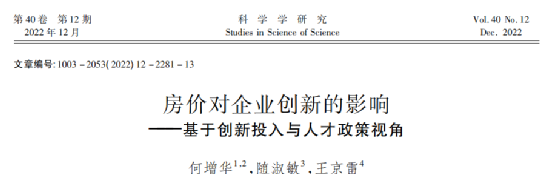 参考文献:何增华,随淑敏,王京雷.房价对企业创新的影响——基于创新投入与人才政策视角[J].科学学研究,2022,40(12):2281-2293.DOI:10.16192/j.cnki.1003-2053.20220215.002.