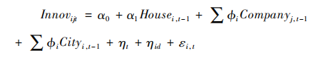 其中,i 表示城市,j 表示企业个体,t 表示年份,被解释变量 Innov 为企业创新,主要解释变量 House城市商品房销售平均价格,Company 为企业层面的控制变量集,City 为城市层面的控制变量集,ηt 和ηid 表示年份和行业固定效应,εi,t 为随机扰动项。为避免内生性问题,所有解释变量和控制变量均滞后被解释变量 1 期。此外,考虑到随机扰动项之间的相关性,所有计量模型均对公司代码进行聚类分析( Cluster)。得到回归结果如下: