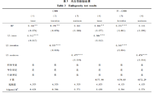 结果表明,滞后 3 期的企业创新水平与当前的企业创新水平在 1% 的水平下显著正相关,并且在加入被解释变量的滞后项后,房价仍然显著促进了企业专利授权总量和发明专利授权量,但对非发明专利授权量的影响则不显著,这一结果与基准回归分析结果保持一致。