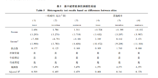 无论是一线城市还是其他城市,在加入房价收入比二次项后,房价对企业创新的影响均不显著。但不难发现,房价对一线城市企业创新具有一定的先促进后抑制的倒 U型影响,对其他城市企业创新则具有一定的先抑制后促进的正 U 型影响。