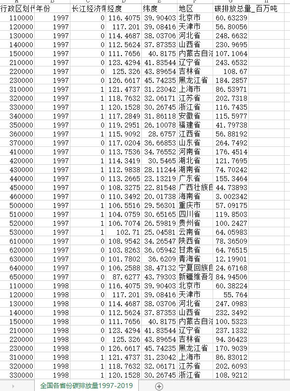 :行政区划代码 年份 长江经济带 经度 纬度 地区 碳排放总量