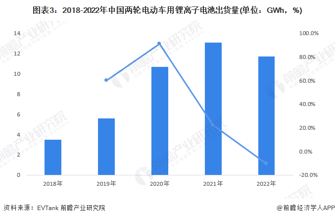 据EVTank统计数据,2018-2021年,中国两轮电动车用锂离子电池出货量逐年增长,2021年中国两轮电动车用锂离子电池出货量达13.1GWh;而2022年首次出现下降,出货量为11.7GWh,故2022年,锂电版两轮电动车的产量为1151万辆,同比减少12.6%,导致其总体渗透率由2021年的24.2%下滑至2022年的19.5%。主要系2022年锂电池价格高涨,厂商为控制成本支出而选择相对便宜的铅酸电池。